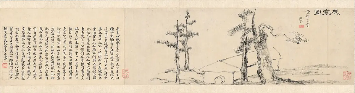 작품은 1844년 유배 중이던 김정희가 제자 이상적에게 그려준 그림으로, 거칠고 메마른 필치로 한겨울의 황량함과 선비의 변하지 않는 마음을 간결하게 표현했다.