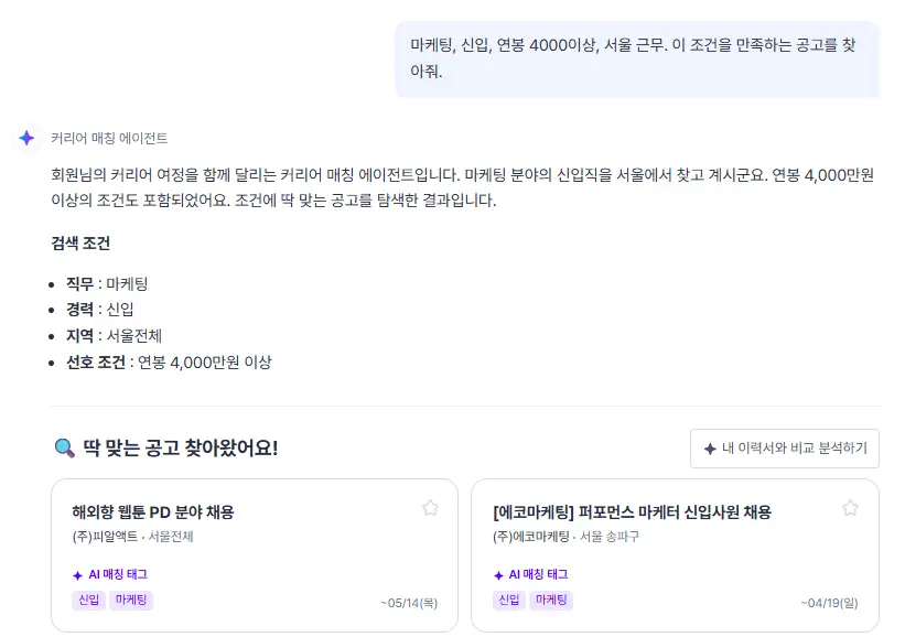 사람인이 올해 3월 ‘커리어 매칭 에이전트’를 내놨다. 이 서비스는 구직자를 위한 최적의 일자리부터 합격 솔루션까지 제공하는 초개인화 AI 비서다. 해당 서비스에 “마케팅, 신입, 연봉 4000만 원 이상, 서울 근무”라고 입력하자 AI가 의도를 파악해 공고 6개를 추천했다.