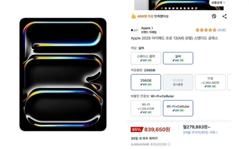 29일 업계에 따르면 지난 27일 오후 쿠팡에서 ‘아이패드 프로 13인치 M5’ 모델이 약 83만 원에 등록되며 단시간에 구매가 이어졌다. 해당 제품은 공식 판매가가 239만 9000원에 달하는 플래그십 모델로, 통상 가격 대비 3분의 1 수준에 불과한 금액이었다.